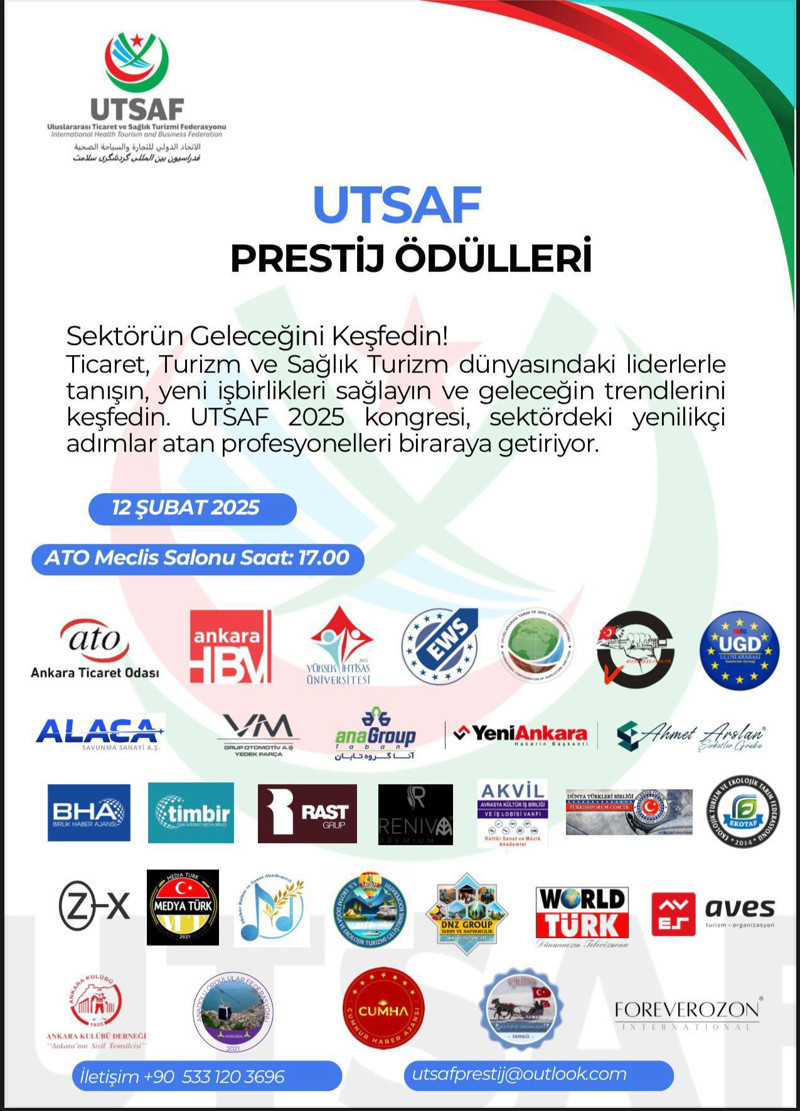 Ankara, 12 Şubat 2025’te sağlık turizmi sektörünü bir araya getirecek önemli bir etkinliğe ev sahipliği yapmaya hazırlanıyor. Uluslararası Ticaret ve Sağlık Turizmi Federasyonu (UTSAF) tarafından düzenlenen UTSAF Prestij Ödülleri, sağlık ve ticaret dünyasındaki başarılı isimleri onurlandırmanın yanı sıra, Türkiye’nin sağlık turizmi alanındaki uluslararası iş birliklerini güçlendirmeyi hedefliyor. ATO Meclis Salonu’nda gerçekleşecek organizasyon saat 17.00’de başlayacak. Yeni Ankara haber sponsorluğunda düzenlenecek etkinlik, sektördeki önemli gelişmeleri ve yenilikleri daha geniş kitlelere ulaştırma fırsatı sunacak.
