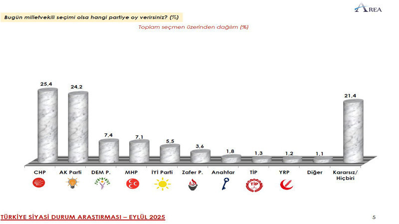 Araştırmaya göre kararsız seçmenler kritik bir konumda. Kararsızlar yüzde 21,4 ile kritik bir rol oynarken, CHP yüzde 25,4 ile ilk sırada yer alıyor. İkinci sıradaki AK Parti ise yüzde 24,2’de kalıyor.