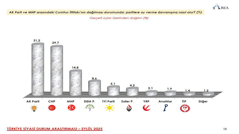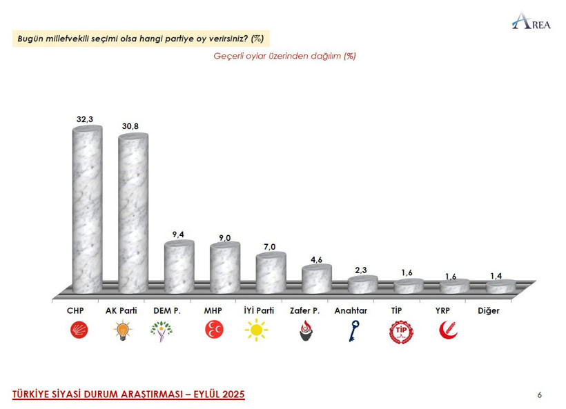 Area Araştırma tarafından gerçekleştirilen “Türkiye Siyasi Gündem Araştırması – Eylül 2025”, 24-30 Eylül tarihleri arasında 26 ilde 2 bin kişiyle yapıldı.