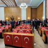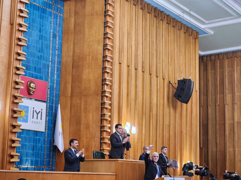 İYİ Parti Lideri Müsavat Dervişoğlu'nun Türk bayrakları ile ayakta karşılandığı salonda, "Ne Mutlu Türk'üm diyene" sloganı atıldı.