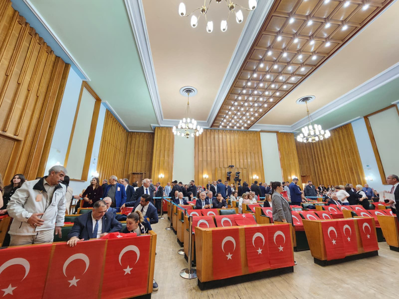 DEM Parti Meclis Grup Toplantısı öncesinde terör örgütü elebaşı Abdullah Öcalan lehine slogan atılmasının ardından, İYİ Parti Meclis Grup, Toplantı Salonunu Türk bayrakları ile donattı.