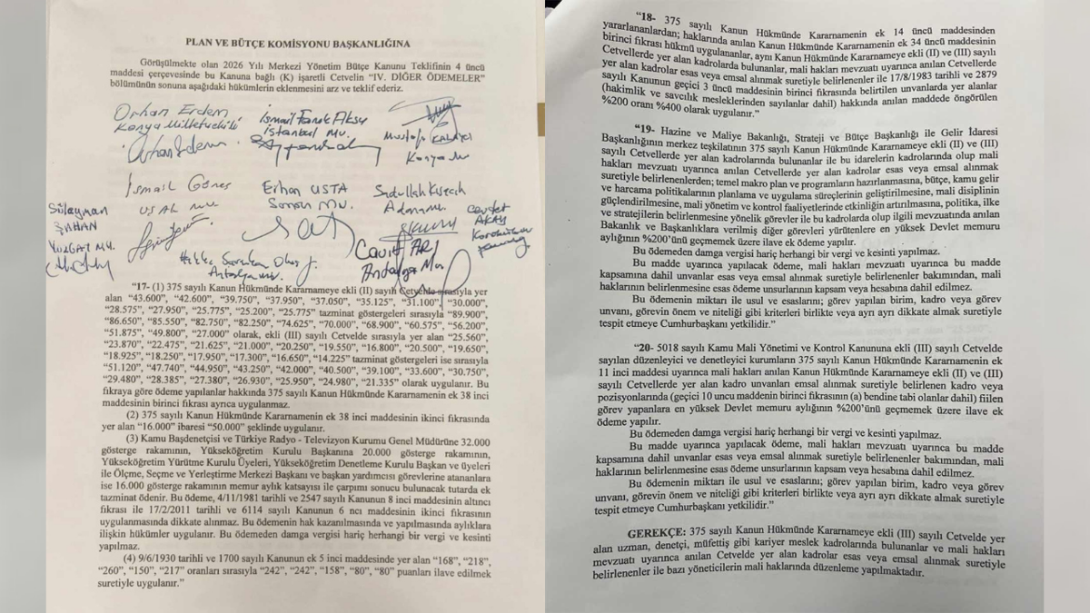 Gözler asgari ücret ve emekli maaşlarına çevrilmişken, TBMM Plan ve Bütçe Komisyonu'nda sessiz sedasız bir "elit zam" kararı alındı. Dün gece geç saatlerde verilen önergeyle, kamudaki üst düzey yöneticiler ve kariyer meslek grupları için maaşlarda devasa bir artışa gidildi. 2026 bütçesine eklenen maddeyle, yaklaşık 10 bin kişiyi kapsayan "seçkin" bir zümreye ayda 30 bin liraya kadar ek ödeme yapılacak.