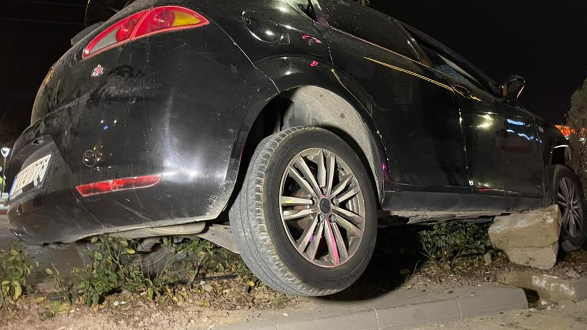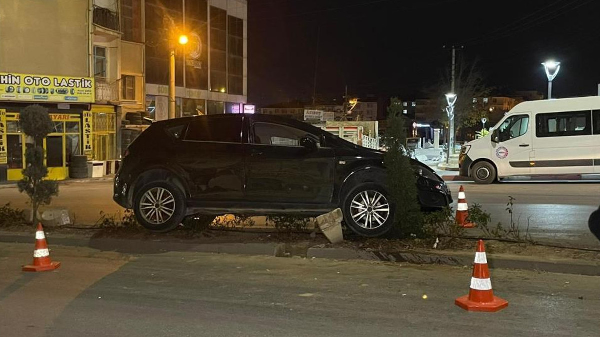 Karaman’da kontrolden çıkan bir otomobil, refüje çıkarak beton dubada askıda kaldı.