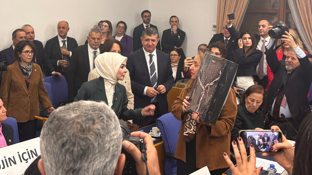 Aile ve Sosyal Hizmetler Bakanı Mahinur Özdemir Göktaş salona girdiğinde, CHP Ankara Milletvekili Semra Dinçer, yaşanan kadın cinayetlerini gündeme taşıdı. Dinçer, “Sayın Bakanım, Meclis’e kan bulaştı. Saliha’nın hırkası burada. Artık Saliha bu hırkayı giyemiyor. Meclis emekçisi Saliha Akkaş, 37 yerinden bıçaklanarak hayatını kaybetti ve ona sahip çıkamadınız. Peki Saliha’nın umutları ne oldu, Sayın Bakanım?” ifadelerini kullandı.