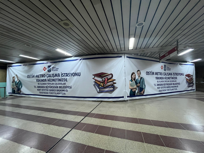 OSTİM Metro İstasyonu'nda yürütülen çalışmalar, Ankara Büyükşehir Belediyesi Kent Estetiği Dairesi Başkanlığı tarafından gerçekleştiriliyor. Pankartta ayrıca kitap yığınlarının bulunduğu bir görsel ve üniversite öğrencilerini temsil eden genç çift figürleri de dikkat çekiyor. Bu yeni istasyon, öğrencilerin toplu taşıma ile ulaşım sırasında rahatlıkla ders çalışabileceği bir mekân sunacak.