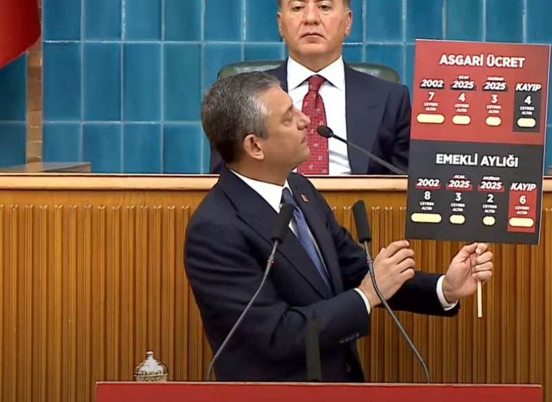 2002 yılında asgari ücretlinin yedi tane çeyrek altın alabildiğini vurgulayan CHP lideri Özel, "Bu senenin başında dört çeyrek altına düşmüştü, şu anda ise üç çeyrek altına düştü. Yedinin dördünü kaybetmiş asgari ücretli. Emeklinin durumu daha vahim 8 çeyrek altından 2 çeyrek altına düşmüş" dedi.