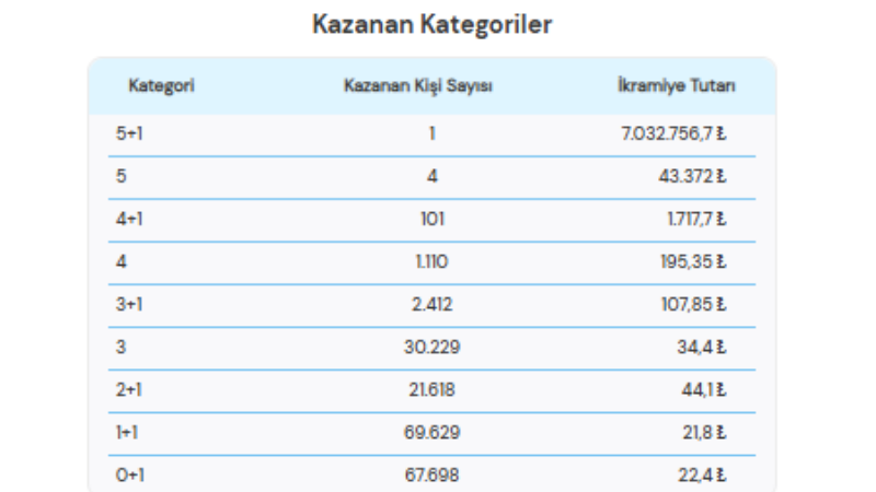 Çekilişte 5+1 bilen büyük ikramiyeyi kazanıyor. Daha az doğru tahmin yapanlar ise kategoriye göre değişen ikramiyelerden faydalanıyor.