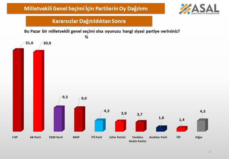 ASAL Araştırma'nın son anketine göre, AK Parti ve CHP arasındaki kıyasıya yarış devam ediyor. İki parti arasındaki fark yüzde 0,7 olarak belirlendi.