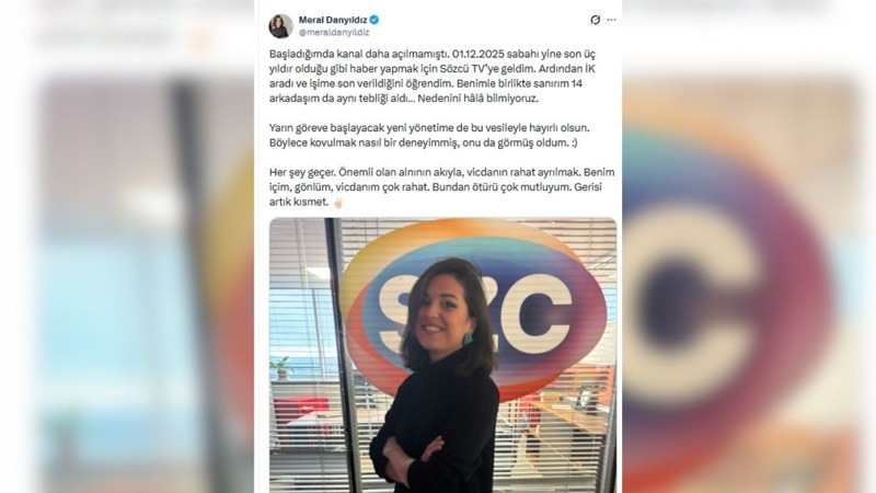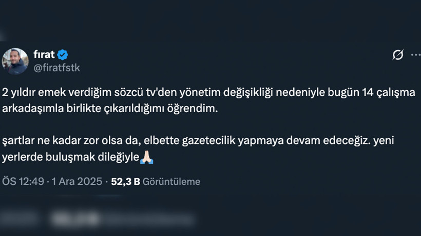 Çalışanlardan işten çıkarmalara dair paylaşımlar da gelmeye başladı. Fırat Fıstık, 2 yıldır çalıştığı Sözcü TV'den yönetim değişikliği nedeniyle bugün 14 çalışma arkadaşıyla birlikte çıkarıldığını X hesabı üzerinden paylaştı.