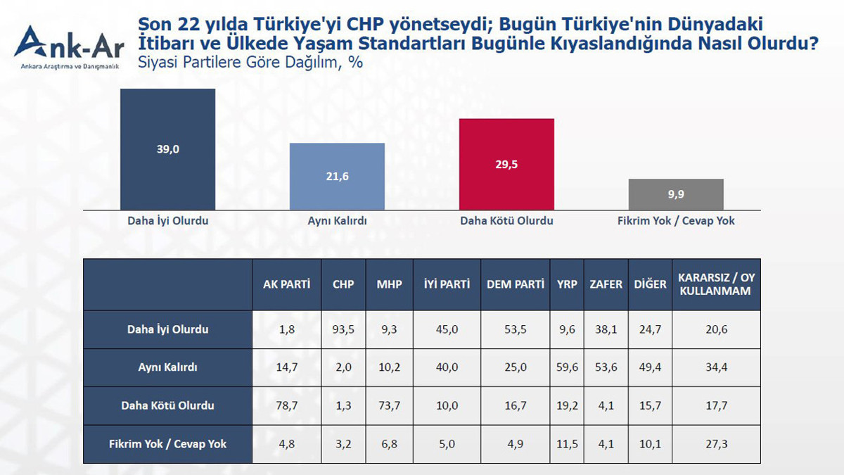 Ankara Araştırma ve Danışmanlık'ın anketine göre seçmenlere “Son 22 yılda Türkiye’yi CHP yönetseydi ne olurdu?" sorusu yöneltildi. Çıkan sonuç şaşırtıcı oldu.
