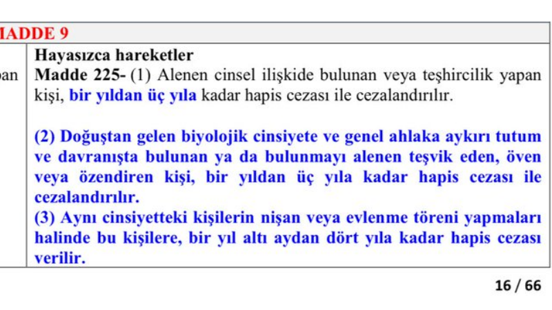 “Doğuştan gelen biyolojik cinsiyete ve genel ahlaka aykırı tutum ve davranışta bulunan ya da bulunmayı alenen teşvik eden, öven veya özendiren kişi, bir yıldan üç yıla kadar hapis cezası ile cezalandırılır.”