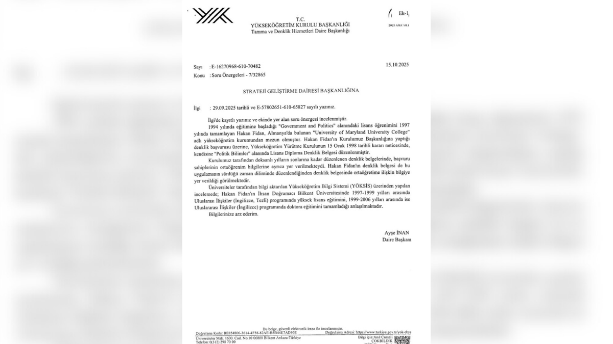 Tan’ın paylaşımına konu olan belge, YÖK Tanıma ve Denklik Hizmetleri Daire Başkanlığı tarafından 15 Ekim 2025 tarihinde hazırlanmış bir resmi yazı. Söz konusu yazıya göre Hakan Fidan, 1994 yılında “Government and Politics” (Hükümet ve Siyaset) alanında başladığı lisans eğitimini 1997’de Almanya’daki University of Maryland University College adlı kurumda tamamladı.
