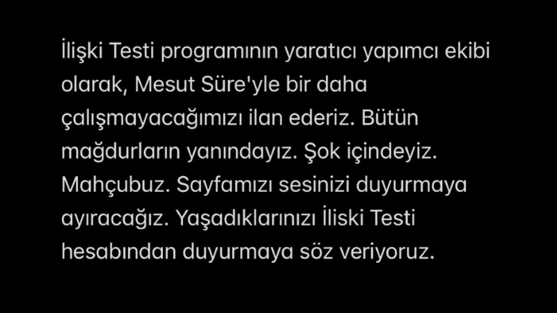 İddialar, bir kadının sosyal medya hesabından yaptığı paylaşım ile gündeme geldi. Kadın, üniversitedeyken staj programı kapsamında Mesut Süre ile tanıştığını ve evine davet edildiği bir olayda tacize uğradığını öne sürdü. Bu paylaşım, kısa sürede binlerce etkileşim alarak tartışma yarattı. “İlişki Testi” yapım ekibinin hızlı bir şekilde Süre ile yollarını ayırması, iddiaların ciddiye alındığını gösterse de, feminist çevreler bu kararın geç kalınmış bir adım olduğunu savunuyor. Kadınlar, yıllarca tacizcilerin kariyerlerine devam etmesine izin veren sistemin bu tür tepkilerle ancak yüzleştiğini belirtiyor. Öte yandan, Süre’nin avukatından henüz bir açıklama gelmezken, bazı takipçiler iddiaların kanıtlanmadan mahkum edici bulunmasını eleştiriyor.