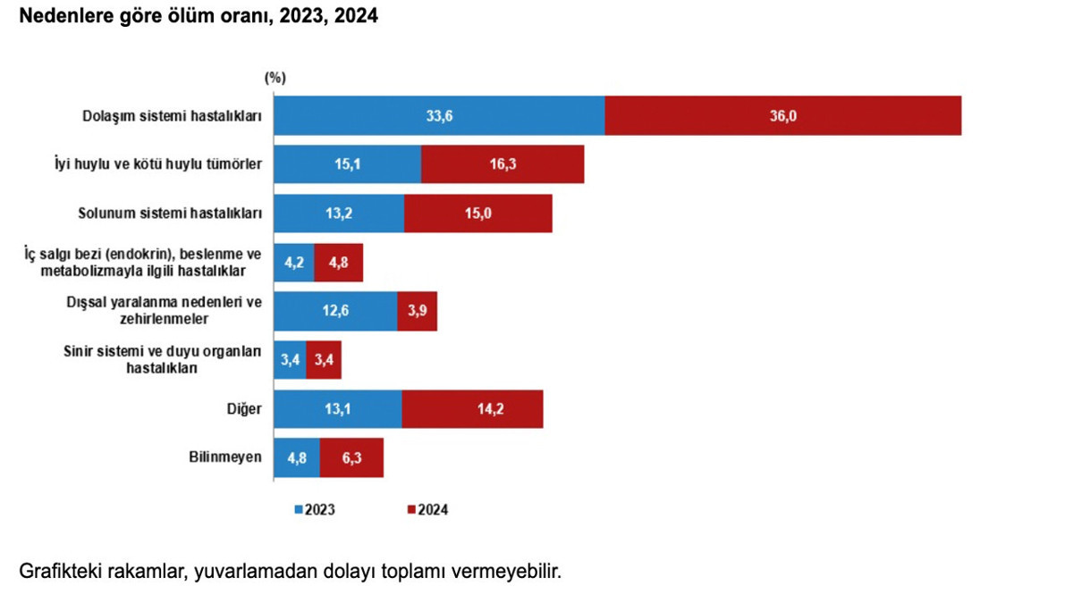 Dolaşım sistemi hastalıkları, 2024’te tüm ölüm nedenleri içinde yüzde 36 ile ilk sırada yer aldı. İkinci sırada yüzde 16,3 ile iyi ve kötü huylu tümörler bulunurken, solunum sistemi hastalıkları yüzde 15’lik payla üçüncü sıraya yerleşti.