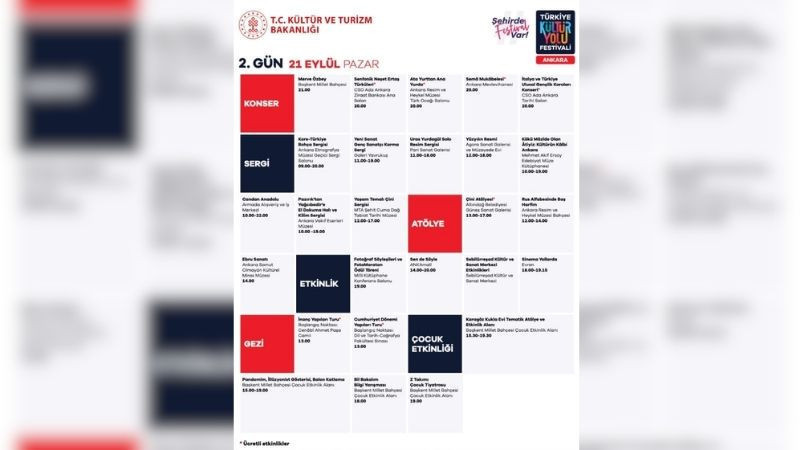 T.C. Kültür ve Turizm Bakanlığı tarafından düzenlenen Ankara Kültür Yolu Festivali, 20-28 Eylül tarihleri arasında birbirinden renkli etkinliklerle başkentlilere unutulmaz anlar yaşatıyor. Festivalin ikinci günü olan 21 Eylül Pazar, konserlerden sergilere, atölyelerden çocuk etkinliklerine kadar geniş bir yelpazede kültür-sanatseverlere hitap ediyor.