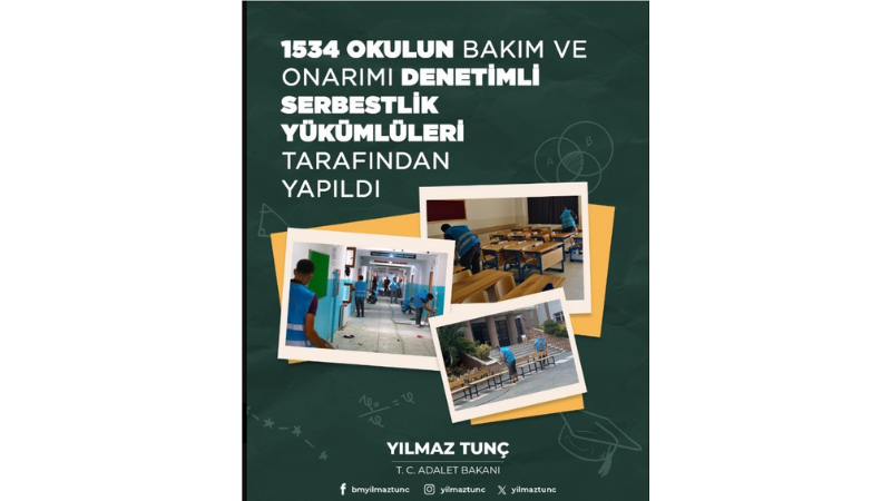 Adalet Bakanı Yılmaz Tunç, Türkiye genelinde bin 534 okulun yaz tatili süresince denetimli serbestlik yükümlüleri tarafından elden geçirildiğini açıkladı.