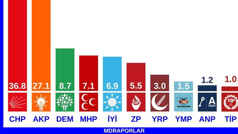 Ankete göre, Cumhuriyet Halk Partisi (CHP) yüzde 36,8'lik oy oranıyla birinci parti konumuna yükselirken, Adalet ve Kalkınma Partisi (AK Parti) yüzde 27,1 ile ikinci sırada kaldı. Bu sonuçla birlikte iki parti arasındaki fark 9,7 puana ulaştı.