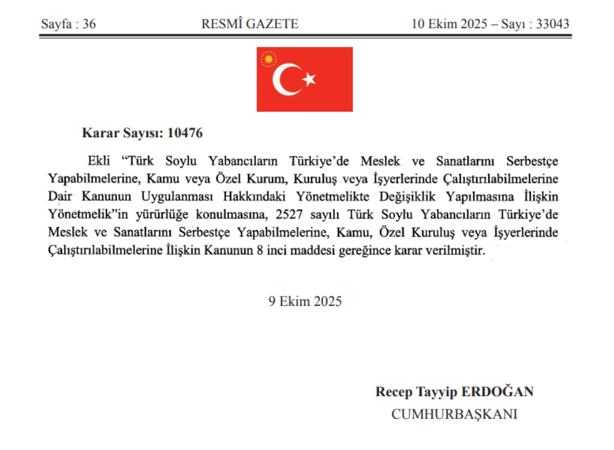Resmi Gazete’de 10 Ekim’de yayımlanan “Türk Soylu Yabancıların Türkiye'de Meslek ve Sanatlarını Serbestçe Yapabilmelerine, Kamu veya Özel Kurum, Kuruluş veya İşyerlerinde Çalıştırılabilmelerine Dair Kanunun Uygulanması Hakkındaki Yönetmelikte Değişiklik Yapılmasına İlişkin Yönetmelik”, Türk Dünyası ile bağları güçlendiren önemli bir adım olarak değerlendiriliyor.
