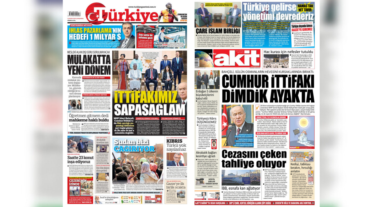 İç siyasette sarsıcı adımlar atan Bahçeli, Cumhur İttifakı'nın birliğini ise kararlılıkla savundu. Türkiye gazetesi, Bahçeli'nin sözlerini "İTTİFAKIMIZ SAPA SAĞLAM" manşetiyle öne çıkarırken, Yeni Akit de "CUMHUR İTTİFAKI DİMDİK AYAKTA" diyerek çıkan "çatlak" iddialarını gidermeyi hedefledi.