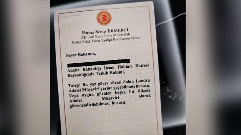 Meclis'te Adalet Bakanlığına iletilmek üzere hazırlanan bir mektup dikkat çekti. Mektup, AK Parti Kastamonu Milletvekili ve TBMM Kadın-Erkek Fırsat Eşitliği Komisyonu üyesi Fatma Serap Ekmekçi tarafından yazıldı. Milletvekili Ekmekçi’nin imzasını taşıyan yazıda, A.B.A. isimli tetkik hâkimi için “özel atama” talebi yer aldı. (Fotoğrafta tetkik hâkiminin açık adı ve görevi yer almaktadır; İsminin baş harfleri haberimizde A.B.A. olarak kısaltılmıştır.)