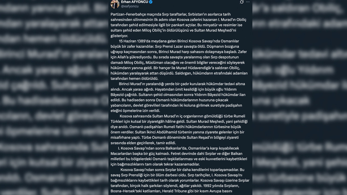 Fenerbahçe, Belgrad’daki Partizan maçında tribünlere asılan ve Osmanlı karşıtı simgeler içeren ırkçı pankarta sert tepki gösterdi. Peki, o koreografinin perde arkasında yatan ne? Onu da Erhan Afyoncu açıkladı.