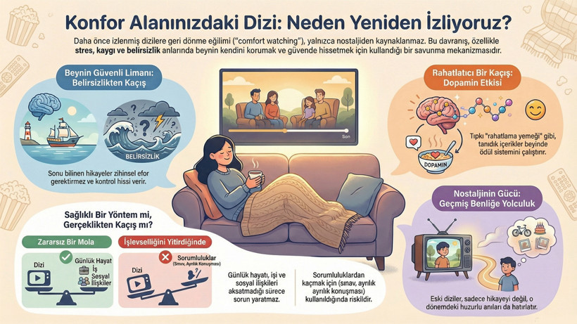 Yeni bir diziye başlamak yerine defalarca izlediğimiz yapımlara geri dönüyoruz. Psikologlara göre bu davranış yalnızca nostalji değil, stres, belirsizlik ve kaygı dönemlerinde beynin kendini koruma refleksi.