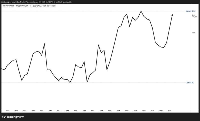 Bu grafik Türkiye’nin büyüklüğünün dünyanın büyüklüğüne göre ORANının grafiğidir. Grafikten görebileceğiniz gibi AK Parti hükümetinin ilk iş başına geldiği 2002-2010 yılları arasında ekonomik olarak güzel bir yarış yaptık ancak 2014’ten sonra daha yeni ayağa kalkabildik. Dünya ticaretinden payımız da son 20 yılda yüzde 50 civarında yükselmiş ama 2007 yılından sonra 17-18 yıl boyunca sadece yerinde saymış.